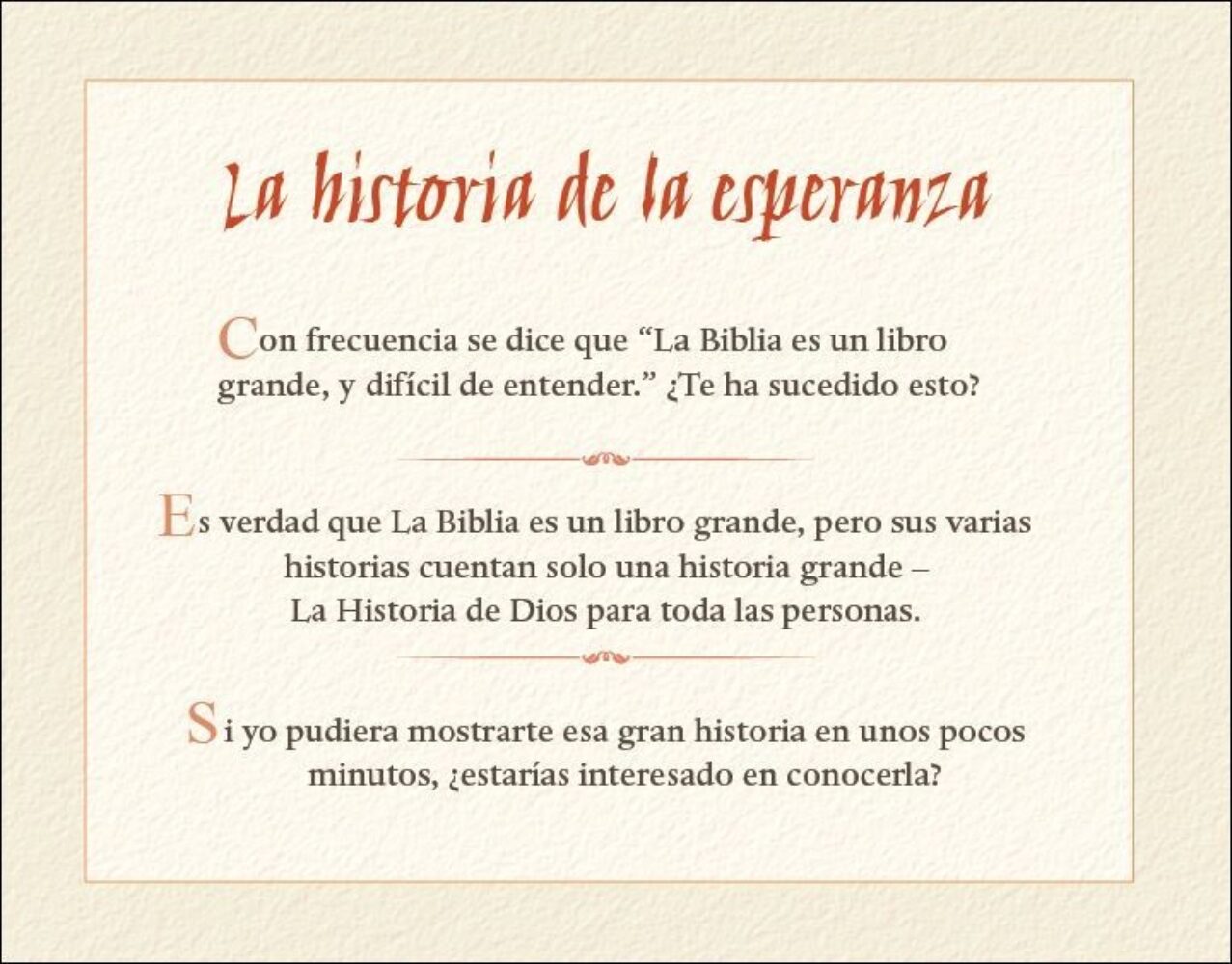 Esta versión de bolsillo de 20 eventos de La historia de la esperanza incluye imágenes a todo color de los siguientes 20 eventos bíblicos: El Dios eterno; La creación del universo; La creación de los seres humanos; La caída de un ángel poderoso; El origen del pecado humano; El origen de la muerte; La promesa de un Vencedor sobre Satanás; La provisión de vestiduras; Sustitutos temporales; Las promesas de un Salvador; El nacimiento de Jesús, el Salvador; He aquí el Cordero de Dios; El encuentro con un líder religioso; Jesús declaró ser uno con Dios; Sufriendo por nuestros pecados; Un hombre culpable es perdonado; De la muerte a la vida; La ascensión de Jesús al Cielo; El juicio del gran trono blanco; Paraíso restaurado. Además de la historia condensada, se enumeran los versículos correspondientes de las Escrituras con cada evento.
