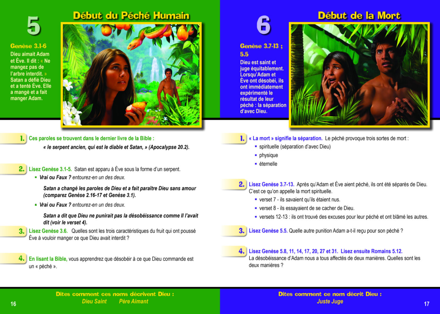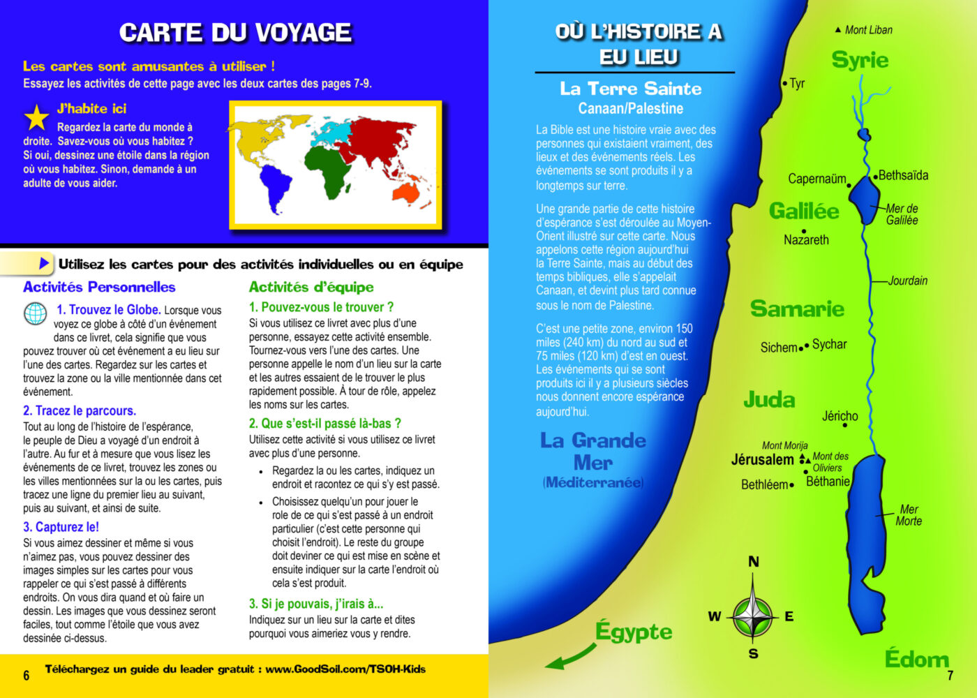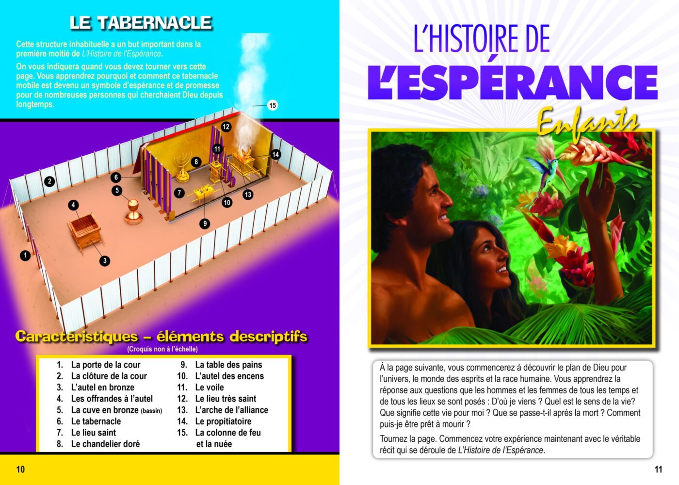 La Simple Histoire de l’Espérance (The Simple Story of Hope - French) has a full page dedicated to each of the 40 Bible event-lessons listed below with ample room for student responses and notes. The book contains 64 pages and is formatted in a workbook style. Its time-versatile “shrinkable and expandable" presentation is great for telling or teaching the Bible's big redemptive story in as few as fifteen minutes or as long as twenty or more hours. It is designed for evangelistic Bible studies, one-on-one or in small groups, but is also helpful in teaching God's redemptive plan to believers.